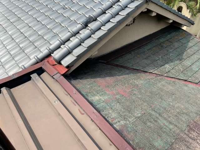 「最近、雨の強い日に天井から雨染みが出てきた」というご相談をいただき、現地調査を行ったところ、立平葺き屋根の水切り板金のジョイント部分と瓦屋根の結合部分からの雨漏り が原因であることが分かりました。