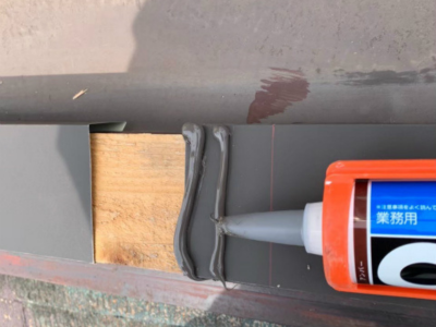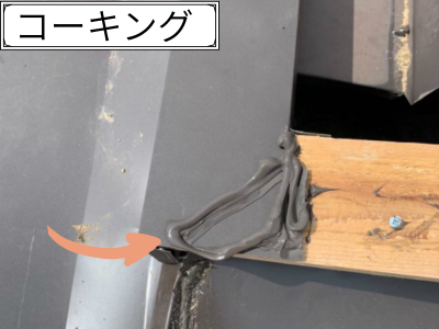 写真のように、板金の継ぎ目や取り合い部分にはコーキング(防水シーリング材)を充填します。コーキングをしっかり施すことで、ビス穴や板金の隙間から雨水が侵入するのを防ぎ、雨漏り対策として非常に重要なポイントとなります。