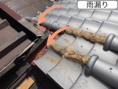 現状を見ていきましょう!!雨漏りの原因はこのように水切り板金と瓦屋根の結合部分からの雨漏りの可能性がございます。