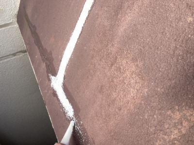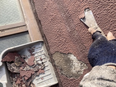 まずは既存の浮きや割れ部分の処理を行いました。塗膜が劣化で全体的に剝れなど割れがすごいですね! ケレンとは、錆びや古い塗膜、浮いてしまった部分を削り落として健全な下地を出す作業です。表面をしっかり整えることで、この後に塗る下地材や塗料が長持ちするようになります。