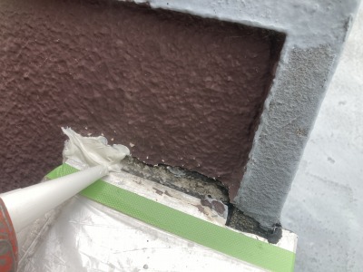 続いて、ひび割れや隙間部分にコーキング材を充填しました。コーキングとは弾性のあるゴム状の材料で、動きや揺れにも対応しながら隙間を埋める役割を果たします。特に壁の浮きが見られた箇所には丁寧に充填を行い、