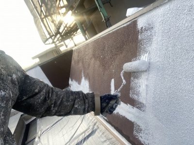 ニッペのパーフェクトフィラーは他のメーカーのフィラーと比べて微弾性がかなり強いです!下地のひび割れ具合で使いますが、今回の現場にはピッタリですね!!ローラーで下塗りしていきます!