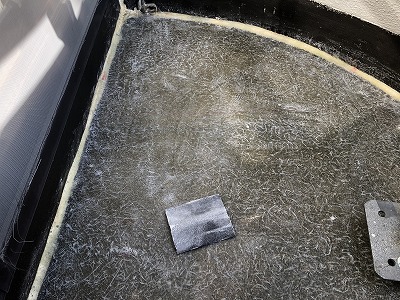 プライマー塗布した後、防水層をつくるために ガラスマット(ガラス繊維でできたシート) を床全体に敷いていきます。