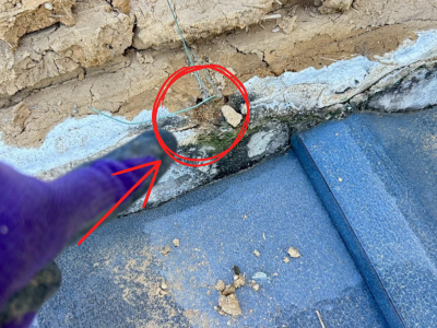 冠瓦・のし瓦を外し、古い葺き土や面戸(めんど)が露出 、面戸(白っぽい帯)と地瓦の取り合いの根元。ここは雨水が溜まりやすく、毛細管で吸い上げられやすい雨の入口です。黒ずみや藻の付着が見えるのは、慢性的な湿りのサイン。細いひび・空洞(穴)が潜んでいる可能性が高いポイントです。今回は棟瓦のズレが発生して面戸付近の穴の露出やひび割れが原因でしたね!