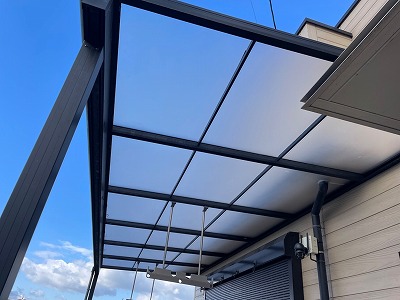 旧アクリル板を撤去後、テラス屋根には耐久性・安全性に優れた「ポリカーボネートパネル」を採用しました。