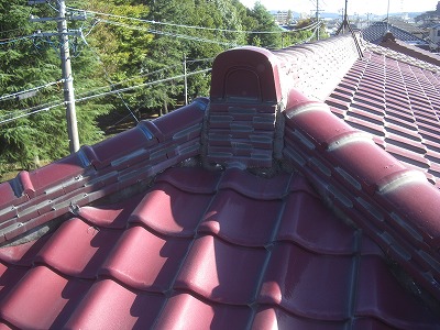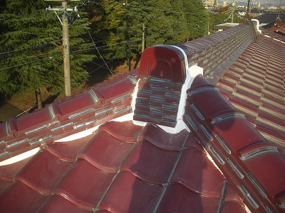 棟部分の漆喰が綺麗に漆喰に入れ替わりました。鬼瓦部分の漆喰や陸棟(一番屋根の上の棟)と隅棟(陸棟から軒先へ下っている棟)を繋ぐ部分の漆喰もキレイになりました。