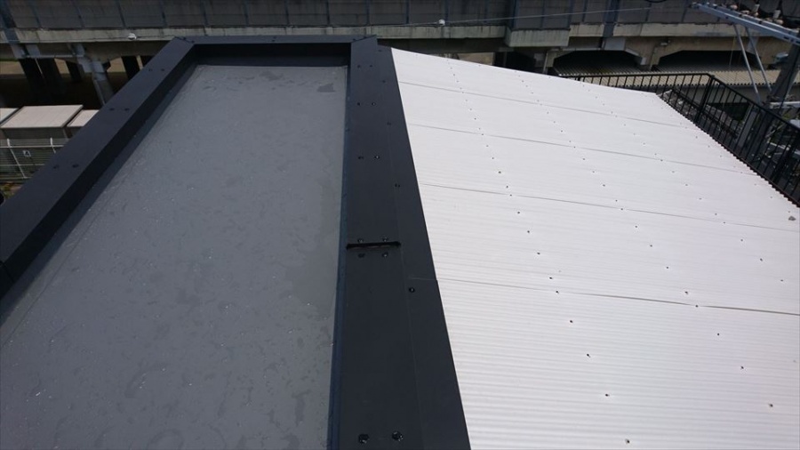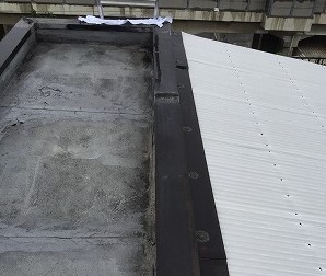調査させていただくと、塔屋は陸屋根になっておりアスファルト防水が切れてしまっていました。また、笠木板金部分も補修跡はありましたがかなり劣化した状態だったため今回はシート防水、笠木板金取り換えの工事をご提案させて頂きました。