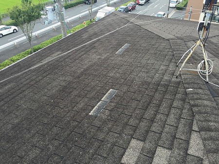 まずは施工前の状況です。こちらの屋根は「アスファルトシングル」という、ガラス繊維にアスファルトを染み込ませたシート状の屋根材が使われていました。