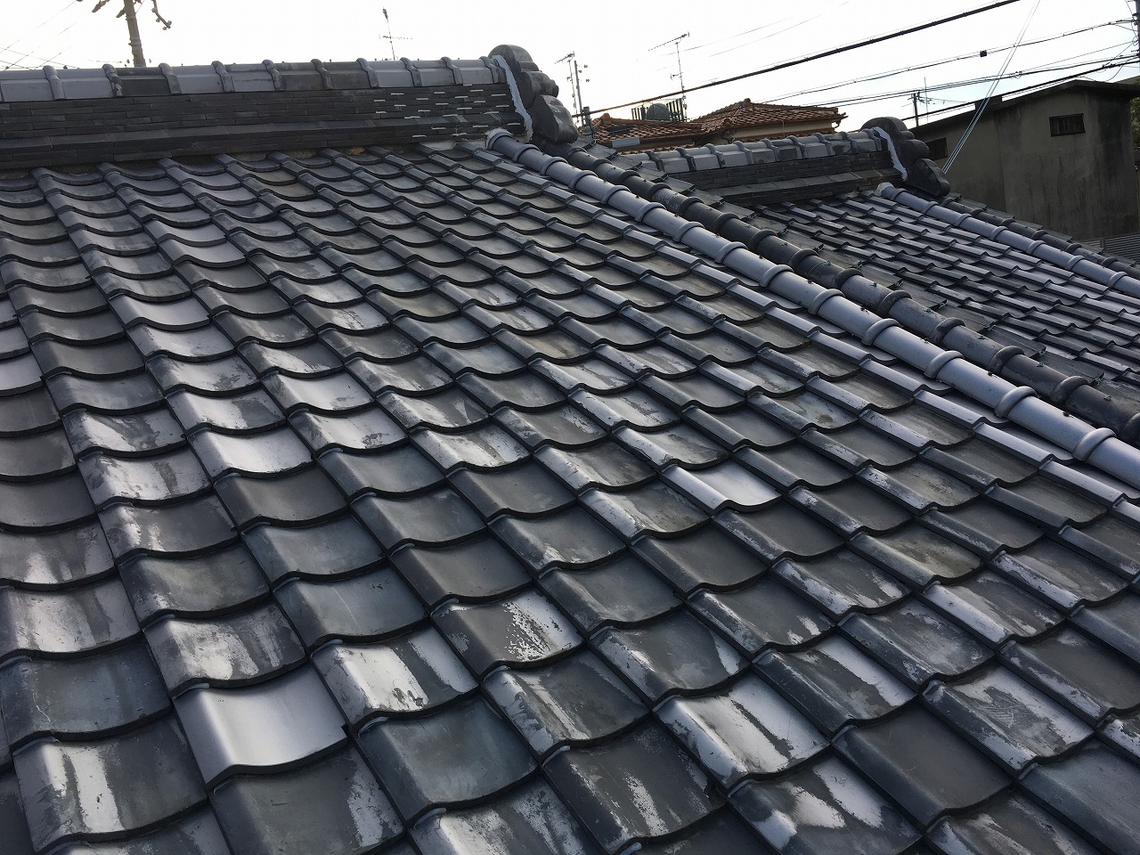 まず現地調査にお伺いしたところ、枚方市の立派な和風住宅に使用されていたのは「いぶし瓦」。粘土を焼いて表面に銀色の膜を張らせた、日本の伝統的な瓦です。