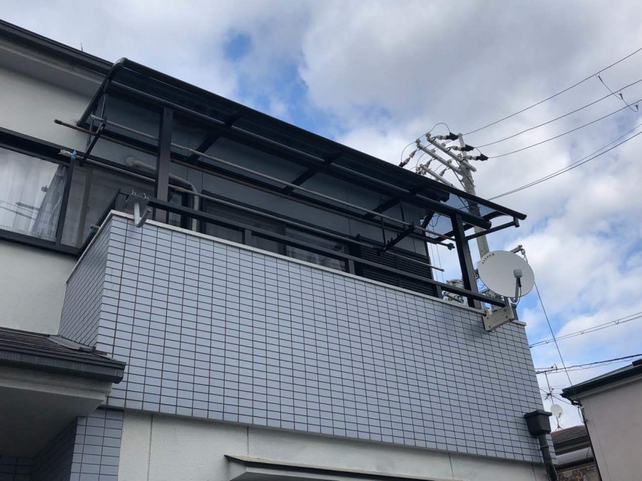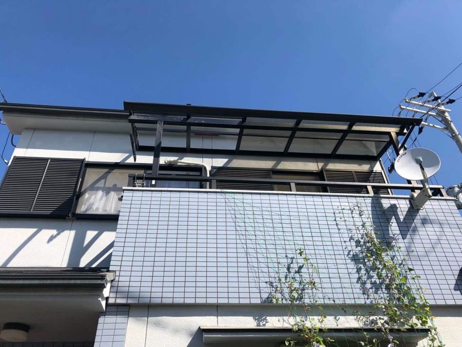 八尾市で2階テラスのポリカーボネート板が飛ばされ、板の張替か取替かでご検討頂いた結果取替工事をさせて頂きました。大型で強い風を伴う台風21号によって被害に遭われた方で、修繕の進んでいない方はたくさん居られます。こちらの方も商品入荷日未定のままお待ちいただいていました。