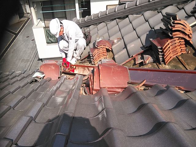新しい谷板金の施工の為に、谷板金周辺の瓦を一時的に取り外していきます。