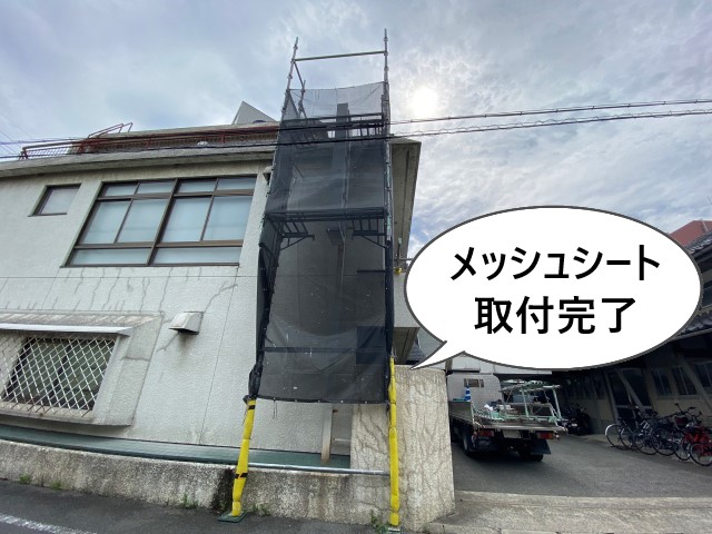 足場部材を組立てると、足場の外周にメッシュシートを取付て足場設置が完了します。