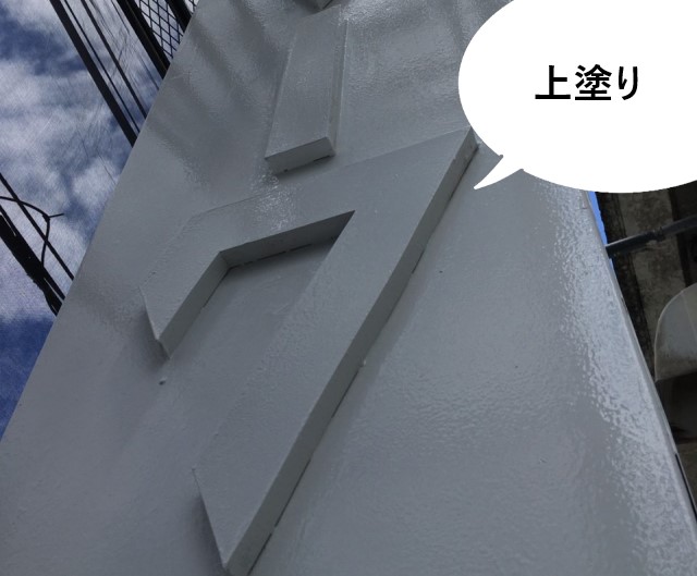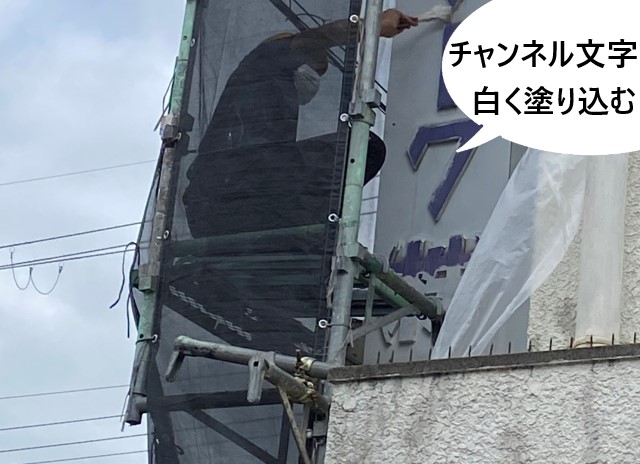 最後にチャンネル文字(箱文字・立体文字)の表面を塗装し、袖看板の塗装工事が完了です。