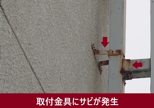 袖看板の表面を保護している塗膜が剥がれ、取付金具などにサビが見られました。