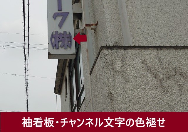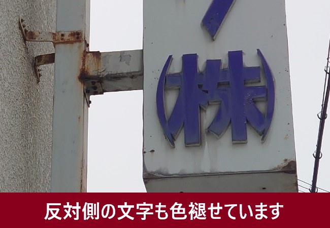 会社名が分かるチャンネル文字(箱文字・立体文字)は目立つデザインなので、視認性を高めます。しかし、チャンネル文字の色が褪せて見えずらくなっています。このように塗膜の保護機能が低下していると、基材の劣化を早めてしまう要因にもなります。