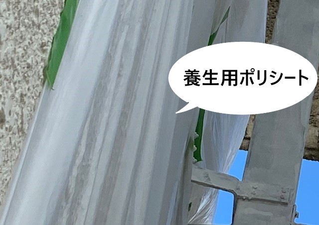 袖看板周辺の外壁などに塗料の付着を防ぐ為に、養生用ポリシートとマスキングテープを使用して養生作業を行いました。