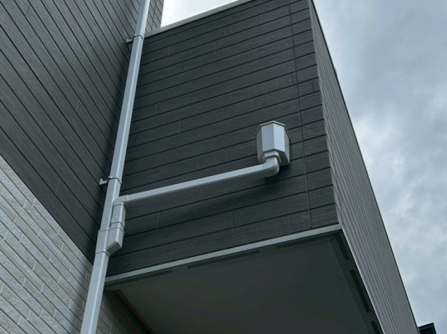 サイズを合わせてカットした呼び樋を上合・竪樋(たてどい)と接続し、雨樋の一部交換が完了です。