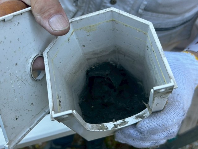 排水口にネットなどの防護がなかったためゴミが溜まりやすくなって完全に詰まってしまい、雨樋の継ぎ目からの水漏れや泥の漏出も確認されました。
