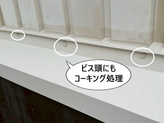 外壁材(角波)との隙間にはコーキング処理を行い、雨水の浸入をしっかり遮断するように施工しました。