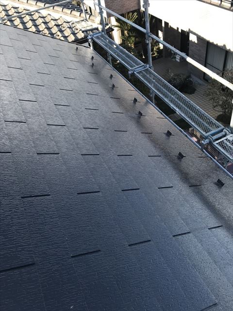 続いては後付け用雪止め設置の写真です。屋根の棟の部分と鼻先部分の中間に設置しました。(