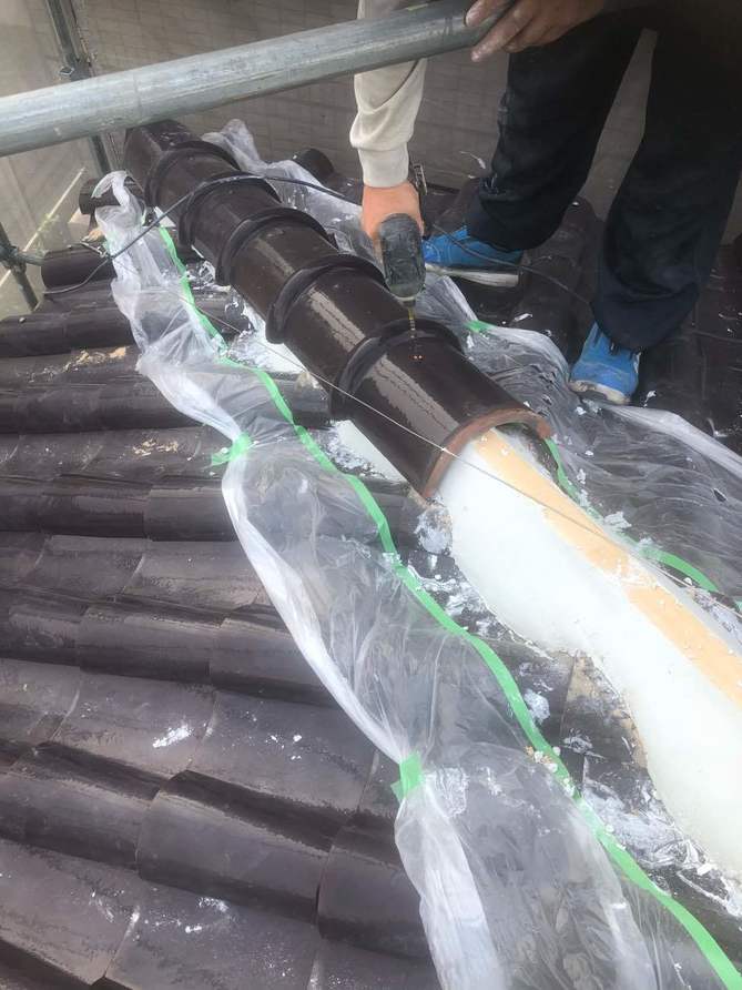 下地の棟木を新しくして、漆喰を塗る際に他の瓦につかない様にしっかりと養生をしていきます。