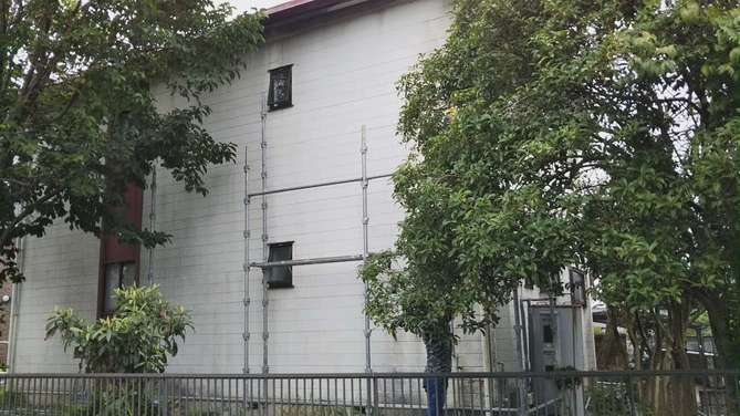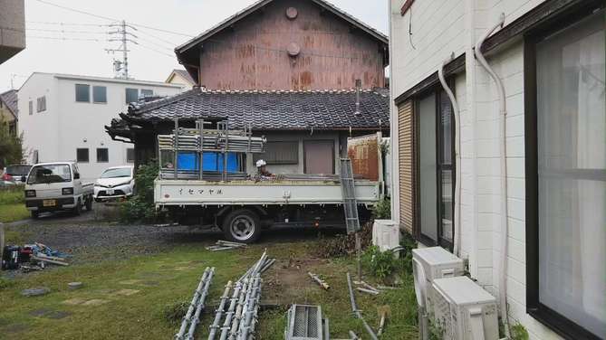 足場を積んだトラックを横づけし足場を組み立てていきます。