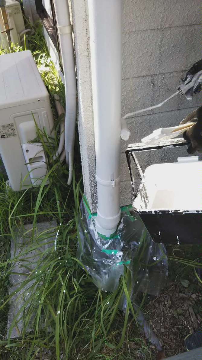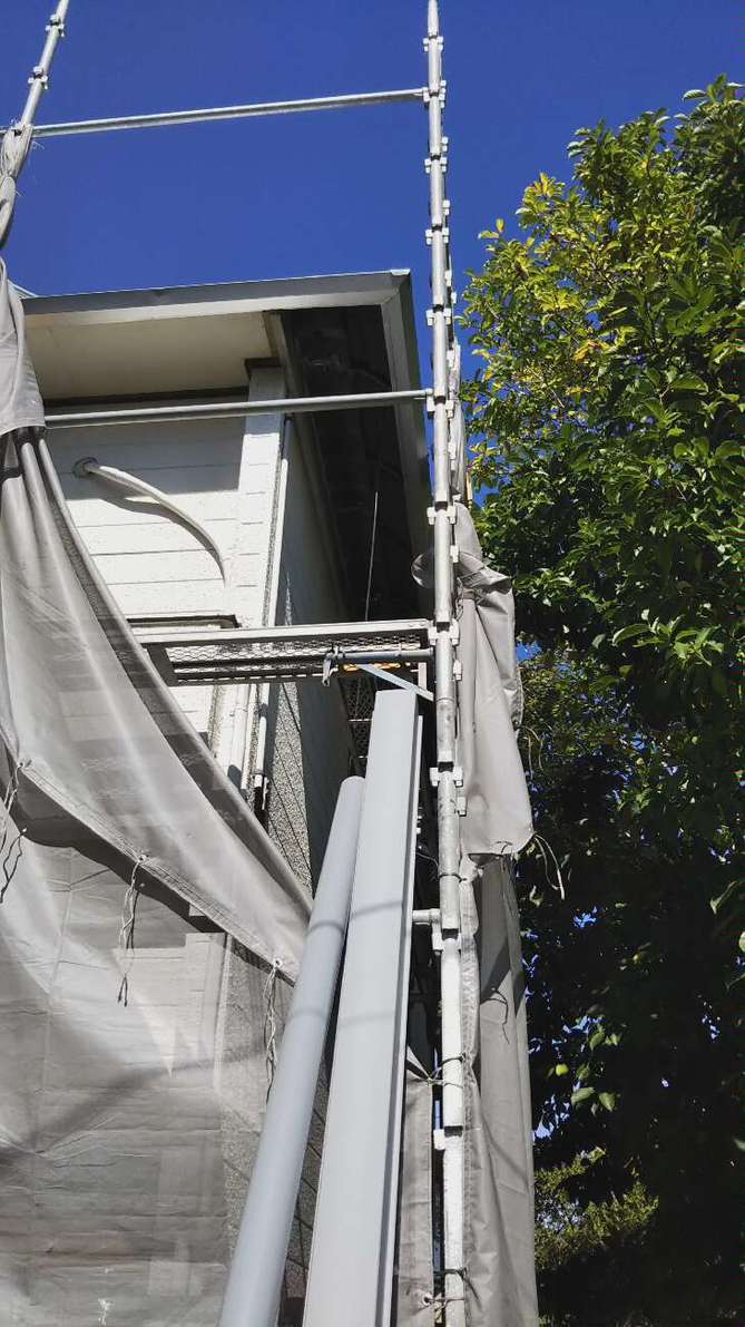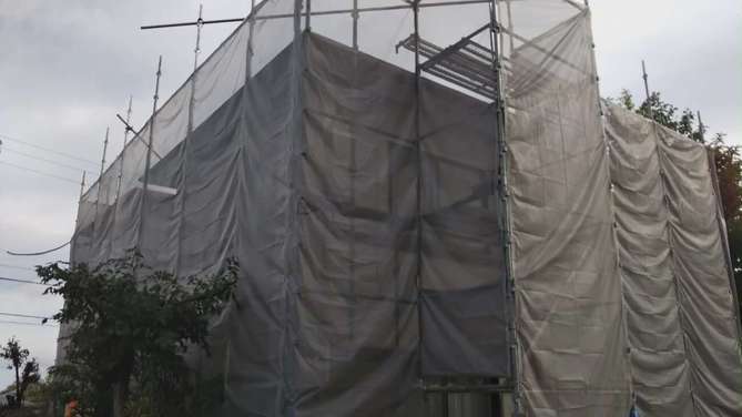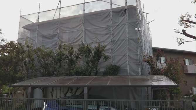 最後に、メッシュのシートで全体を養生し塗料が散布して外に飛ばないよう対策をします。