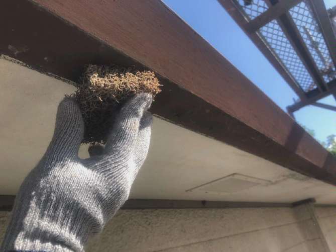 足場が架かったら屋根塗装に入る前に、今回多量の土や砂などが溜まっていたのでまず取り除くために清掃していきます。