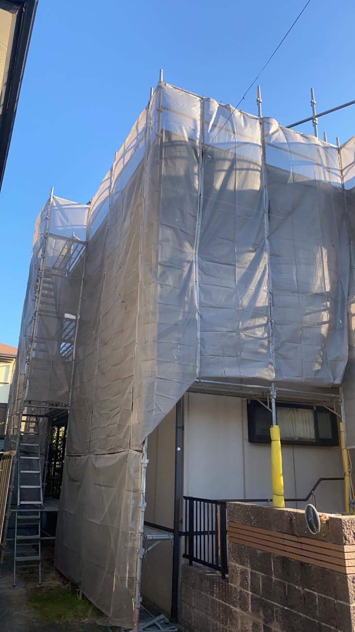 屋根の工事には欠かせない足場を建てます。