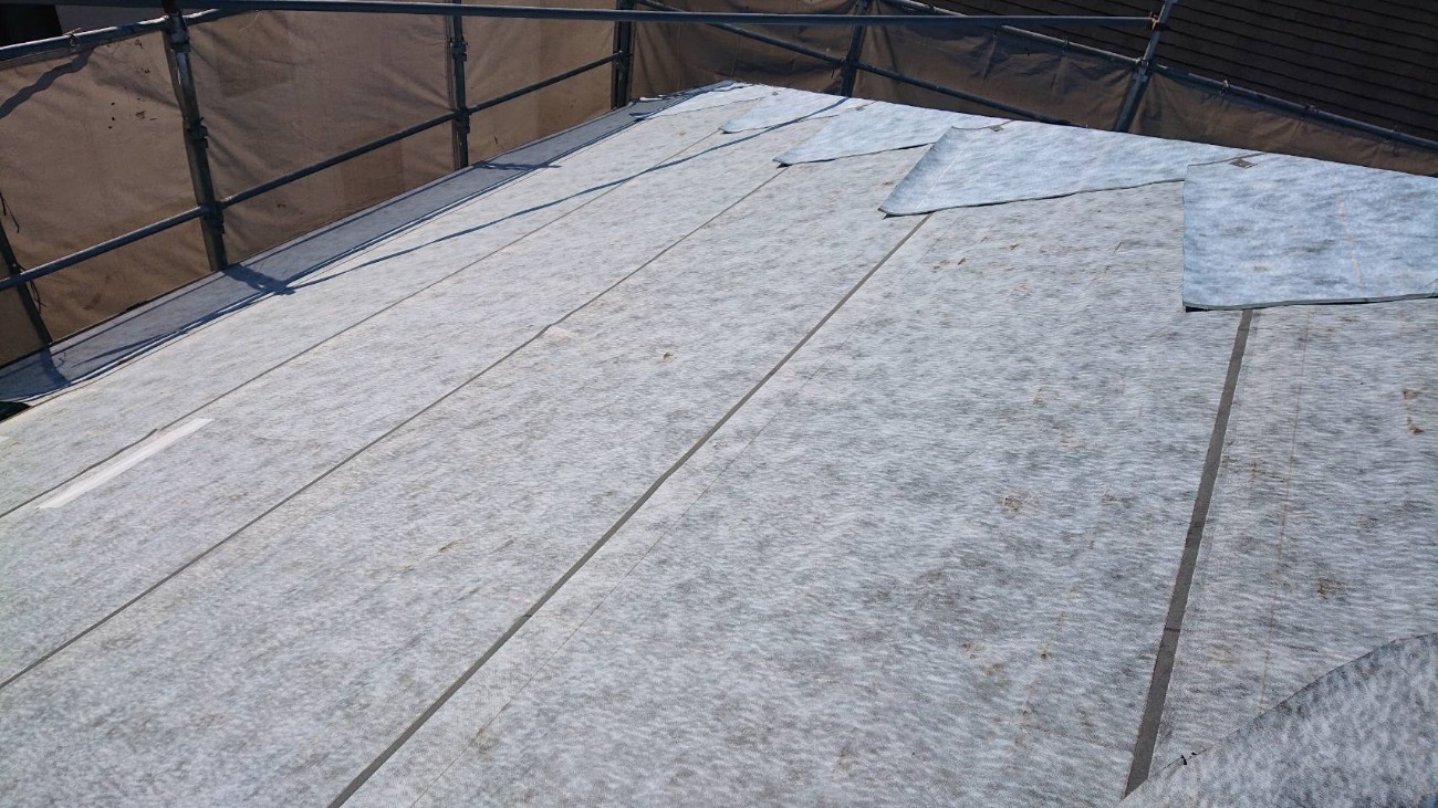 今回は現状のスレート屋根を下地をしてそのまま使用するためコンパネ下地は施工せずそのままルーフィングを張り付けていきます。