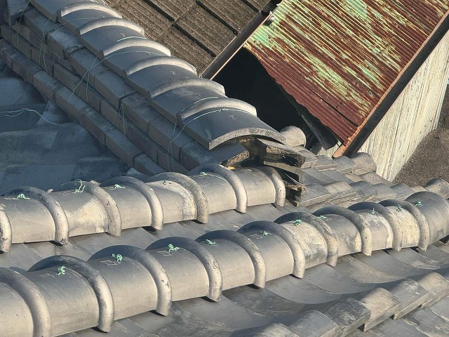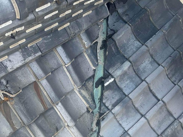 さらに屋根全体を調査すると、瓦のズレ・割れが広範囲に確認され、谷板金(たにばんきん・屋根と屋根のつなぎ目部分に取り付けられた金属板)の劣化や、棟(むね・屋根の頂部)の裏側の露出も見つかりました。