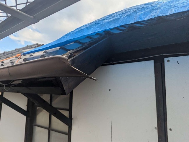 早速現地へ伺って調査を行ったところ、屋根の軒先が大きく折れ曲がっており、瓦が今にも崩れ落ちそうな非常に危険な状態でした。