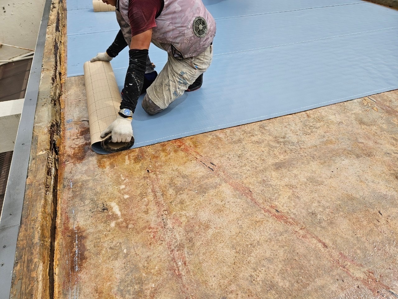 まずは既存の防水シートを、全体的に撤去する作業からスタートしました。撤去後は下地に付着していた古い接着剤やゴミを取り除き、清掃を徹底して行います。
