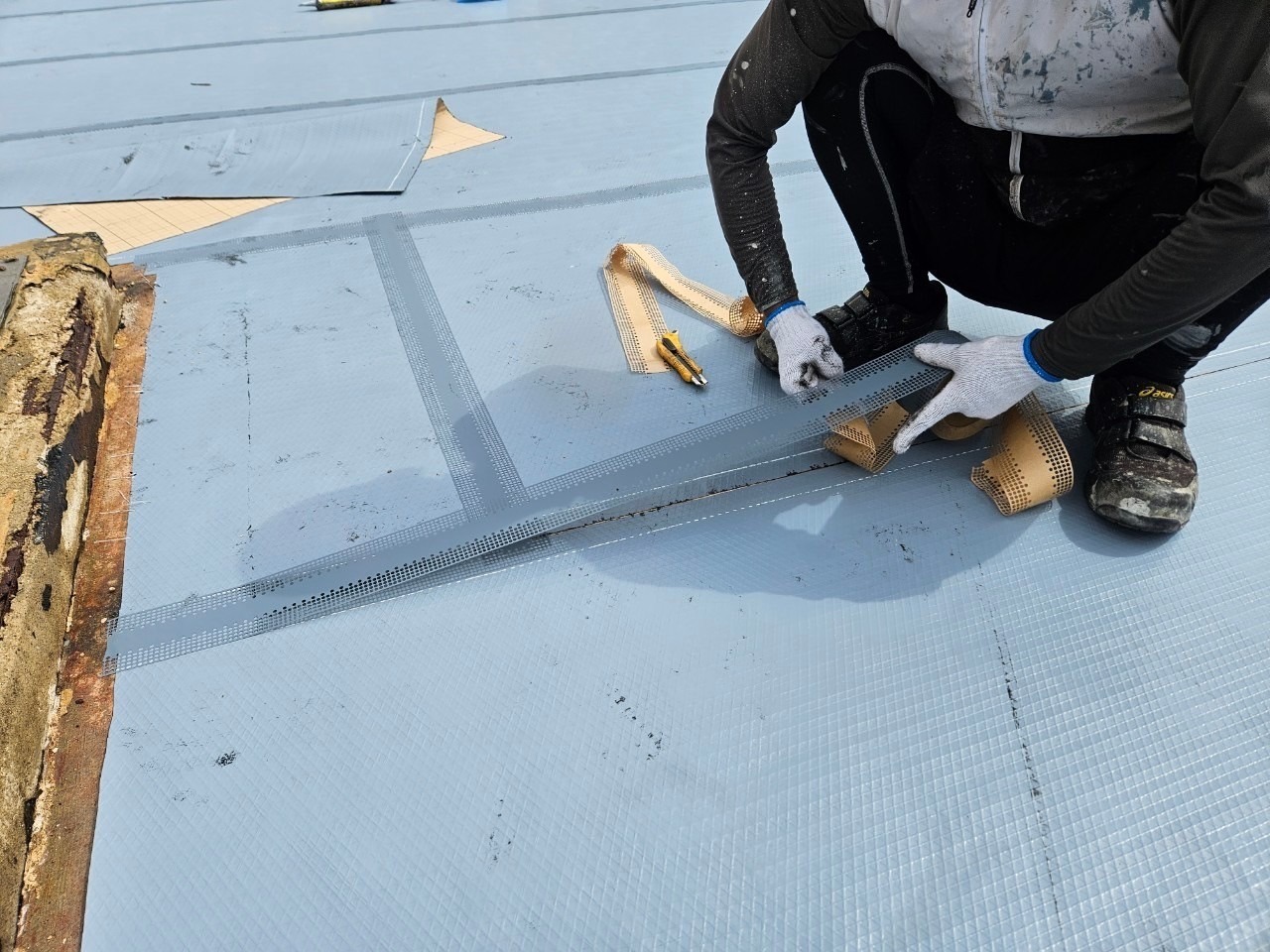 その後、下地と防水層の間に敷く「通気緩衝シート」を丁寧に貼り付けていきます。立ち上がり部分やドレンまわりなど、特に傷みやすい箇所は補強用のテープを重ねて使用することで、防水層の耐久性を高めました。