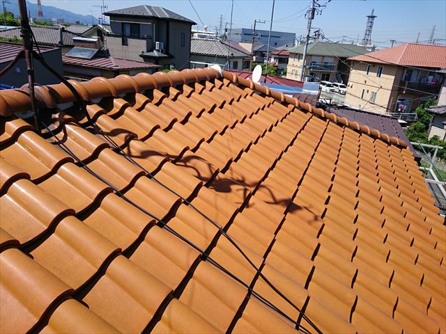 少しのオープンタイムを取った後、元通りに棟瓦を積み直していきます。積み直しが終わると、釘ではなく今回はステンレス製ビスで固定します。ステンレスは錆びませんし、締め込まれたビスは風圧では抜け上がることはありません。ビスの根元にはゴムパッキンが付いていますので、ビスとビス穴の隙間から雨水が侵入することがありません。これで屋根工事は完成です。