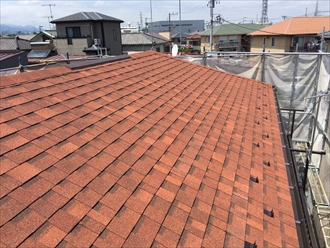 洋風瓦からアスファルトシングル材に屋根の葺き替え工事をさせて頂きました。今回お施主様がお選びになったのはオーウェンス コーニング ジャパン合同会社が販売するオークリッジスーパー<テラコッタブレンド>という商品で、ファイバーグラスが練り込まれたシングル屋根材です。