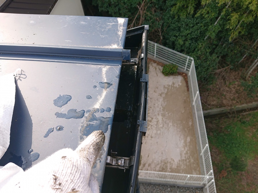 2階の屋根の軒樋(のきどい・横方向の雨樋)を確認すると、樋が詰まって雨水が溜まり、枯れ葉が浮いている状態でした。