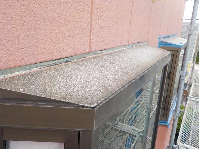 出窓の天板とサッシは継ぎ目部分になるので、周囲にシーリングを充填して防水していますが、全体的に剥離やひび割れの症状が出ていました。