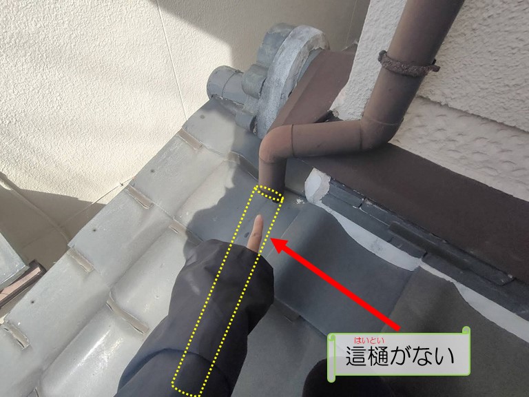 泉大津市M様邸では、本来1階部分の屋根沿いに設置されているはずの這樋(はいとい)が取り付けられていないことが判明しました。