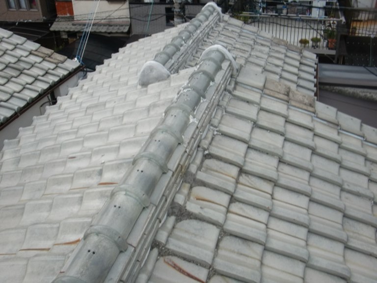 忠岡町で台風被害にあったY様邸の屋根を見てみると、屋根の表面には、瓦と瓦の間に大量のコーキング材が塗布されている状態でした。