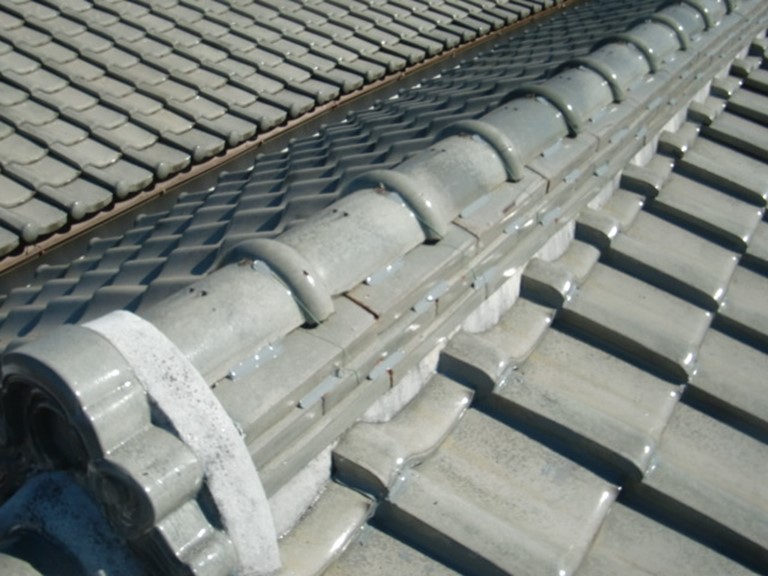 忠岡町で台風被害にあった瓦屋根の桟瓦と桟瓦の隙間には、雨水の浸入を抑制する目的でコーキング材であるシリコンクールを適切に充填しました。