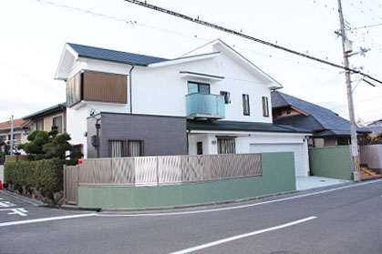 以前2階に玄関があり、外付けの階段で出入りしていましたが、1階に玄関を設け、以前玄関だった2階は窓を入れ小さなベランダになりました。車庫も一部増設し、外壁一部は「アーバントーン」という多彩模様のシリコン塗料で仕上げ、美しいアクセントになり耐久性もましました。