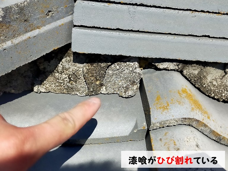 降棟の面戸漆喰にひび割れや欠損が見られました。
