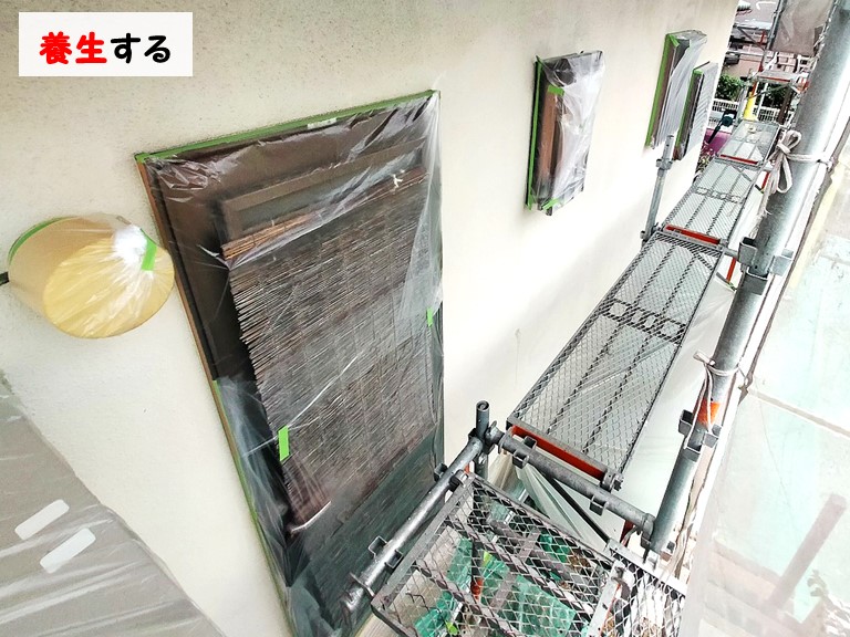 外壁塗装作業に入る前に、窓枠やサッシ、玄関ドアなど塗料を付けたくない箇所にはテープやビニールで養生します!