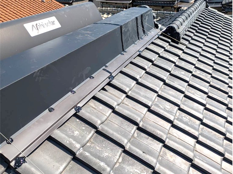 岸和田市で棟瓦の雨漏り修理!太陽光パネルに配慮した板金設置事例 約26万円(工期 1日)