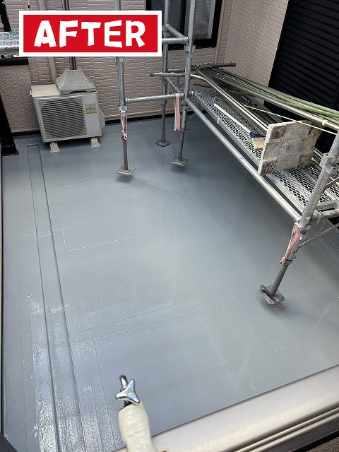 下塗りが完了したら、次はいよいよ中塗りです!この工程では、塗膜に十分な厚みを持たせることで、塗料本来の耐久性や防水性をしっかりと発揮させます。また、お客様にお選びいただいた仕上がりの色を塗る最初の工程でもあります。ムラなく丁寧に塗り重ねることで、美しい発色と均一な色合いを実現します✨職人の腕の見せ所です!