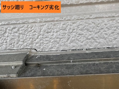 サッシまわりは特に雨水がたまりやすい箇所ですが、ここでもコーキングの割れが確認できました。