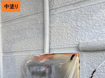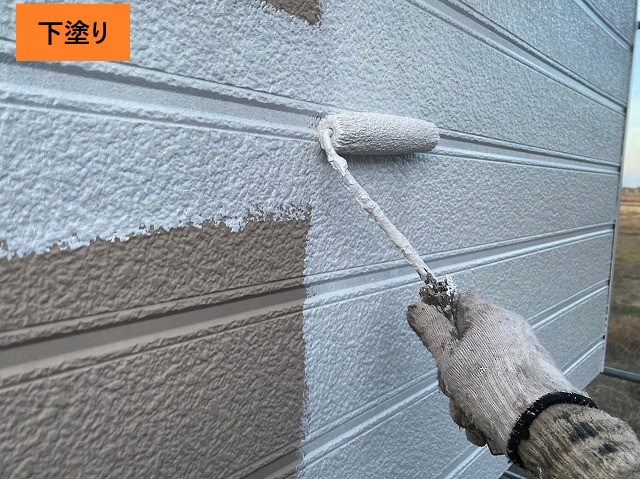 下塗りでは、外壁材と塗料をしっかり密着させるための専用塗料をローラーで均一に塗り広げました。
