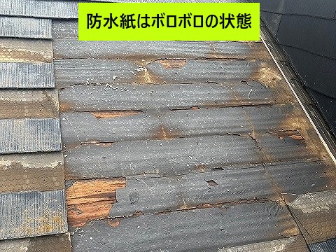 屋根材を撤去すると、内部の状態が見えてきますが、防水紙は変色し、ボロボロに劣化している状態でした。