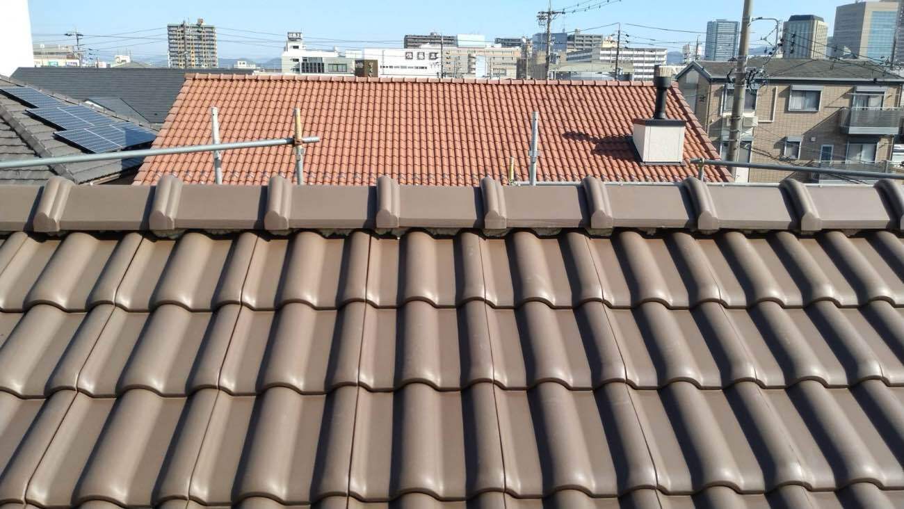 仕上がり写真では、棟瓦がきれいに並び、ビス留めされた箇所も確認でき、全体として引き締まった印象です。棟が整うと屋根全体の見栄えが良くなるだけでなく、要所が締まって見えるため住まいの印象まで変わって感じられます。工事後の屋根は、施工前に見えていた漆喰の荒れや欠けが目立たなくなり、安心して過ごせる状態へ近づきました。お客様にも「これでしばらく心配しなくていいね」と思っていただけるような仕上がりを目指して作業を締めています。